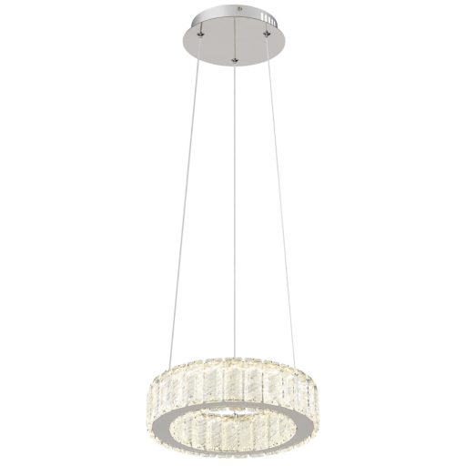 Króm színű fém vázas függeszték lámpa K5 kristály dekorral, beépített LED fényforrással. A lámpához távirányító tartozik, mely segítségével állítható a lámpa fényereje, színhőmérséklete (2700K,4000K,6000K), továbbá a lámpa memória és éjszakai fény funkcióval is rendelkezik. A fényerő fali kapcsoló segítségével is állíthatóak.