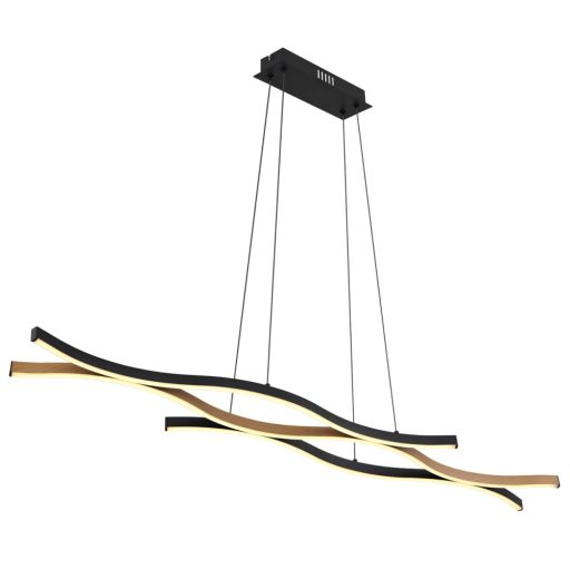 Fekete színű fém vázas függeszték lámpa fa imitációs hullám formával, opálos műanyag betéttel, beépített meleg fehér színhőmérsékletű LED fényforrással.