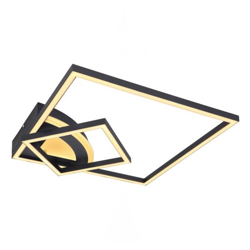 Design mennyezeti lámpa matt fekete színű fém vázzal, opálos akril betétes búrával, 40W beépített meleg fehér színhőmérsékletű LED fényforrással. Fali kapcsoló segítségével állítható, hogy a lámpa minden része, belső íves része, vagy a szögletes részek világítsanak.