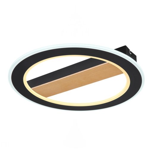 Matt fekete fém vázas, fa betétes mennyezeti lámpa acryl opál búrával, 30W beépített LED fényforrással. A lámpa peremén a LED hideg fehér színhőmérsékletű, a belső gyűrűn pedig meleg fehér színhőmérsékletű.