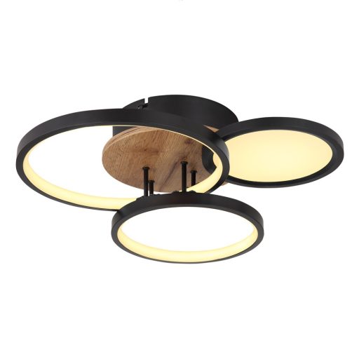 Fekete színű fém vázas mennyezeti lámpa fa betéttel, fekete és opálos akril búrával 30W beépített LED fényforrással.