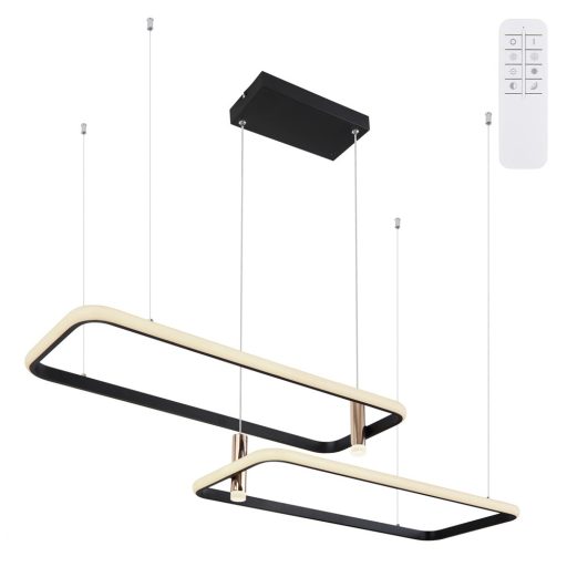 Design függeszték lámpa matt fekete színű fém vázzal, arany színű, rúd alakú fejekkel, opálos akril búrával, 55W beépített LED fényforrással. A szögletes búra külső része, illetve a rudak egyaránt világítanak. A lámpához távirányító tartozék, mely segítségével állítható a lámpa fényereje, színhőmérséklete(2700-6000K között), illetve éjszakai fény és memória funkcióval is rendelkezik.