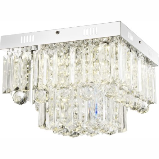 Függő kristály dekoros mennyezeti lámpa króm színű fém vázzal és akril kristályokkal, beépített LED fényforrással.