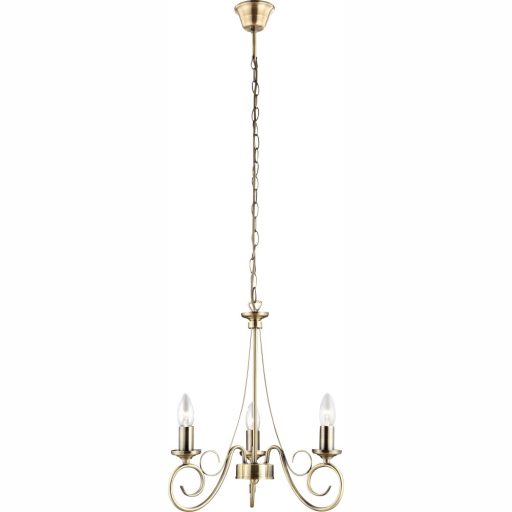 Antik sárgaréz színű, díszes, fém vázas csillár. Gyertyaláng alakú izzót ajánlunk hozzá a tökéletes összhatás végett.