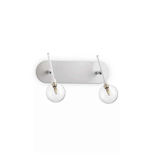 Fehér színű fém spot lámpa állítható fejekkel, gömb alakú átlászó üveg búrával, 2x2W 3000K G4-es cserélhető LED fényforrással.