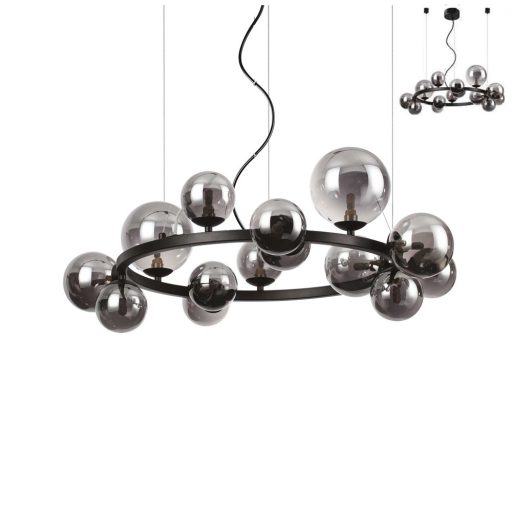 Matt fekete színű fém vázas függeszték lámpa 14db többféle méretű füstös fúvott üveg búrával, cserélhető G9-es meleg fehér fényű LED fényforrással.
