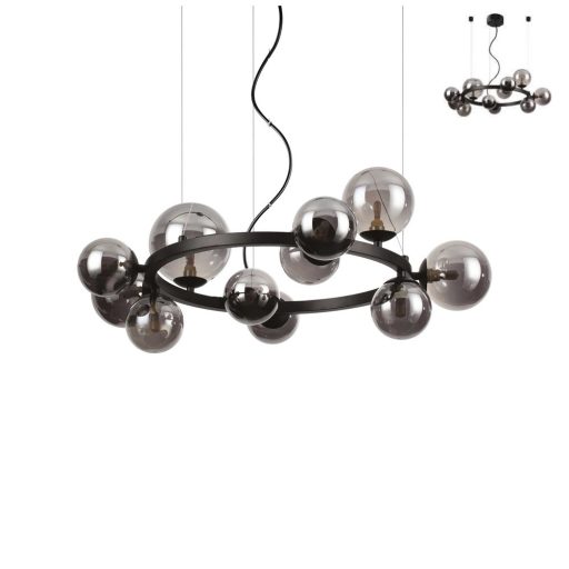 Matt fekete színű fém vázas függeszték lámpa 11db többféle méretű füstös fúvott üveg búrával, cserélhető G9-es meleg fehér fényű LED fényforrással.