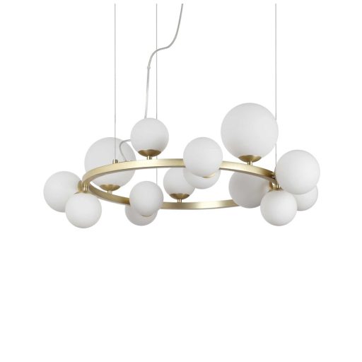 Szatinált sárgaréz színű fém vázas függeszték lámpa 14db többféle méretű opálos fúvott üveg búrával, cserélhető G9-es meleg fehér fényű LED fényforrással.