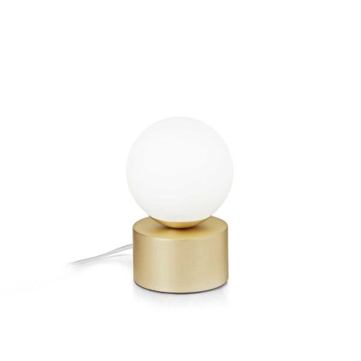 Sárgaréz-fehér színű fém vázas éjjeli lámpa fehér üveg búrával, G9-es foglalattal. A lámpa egyéb tulajdonságai: vezetékre szerelt kapcsoló. 4W 3000K színhőmérsékletű G9-es LED fényforrással szállítjuk.