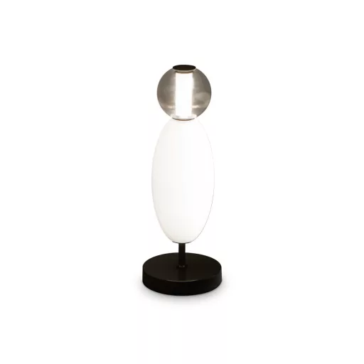 Fekete színű fém vázas komód lámpa fehér-szürke színű üveg búrával, meleg fehér színhőmérsékletű beépített LED fényforrással. A lámpa egyéb tulajdonsága(i): vezetékre szerelt kapcsoló.