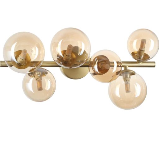 Fekete-sárgaréz színű fém vázas mennyezeti lámpa borostyán üveg búrával, G9-es foglalattal.