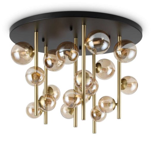 Fekete-sárgaréz színű fém vázas mennyezeti lámpa borostyán üveg búrával, G9-es foglalattal.