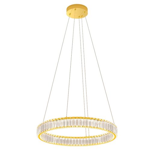 Fényes arany színű fém vázas függeszték lámpa 60cm átmérőjű kristályokkal díszített búrával, beépített meleg fehér színhőmérsékletű LED fényforrással. A lámpa fényereje fali kapcsoló segítségével (fel-le kapcsolással) 3 (30-60-100%) lépcsőben állítható.