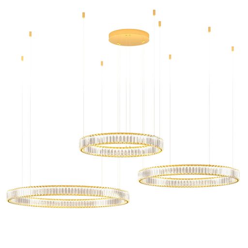 Fényes arany színű fém vázas függeszték lámpa 60,80 és 100cm átmérőjű kristályokkal díszített búrával, beépített meleg fehér színhőmérsékletű LED fényforrással. A lámpa fényereje fali kapcsoló segítségével (fel-le kapcsolással) 3 (30-60-100%) lépcsőben állítható.