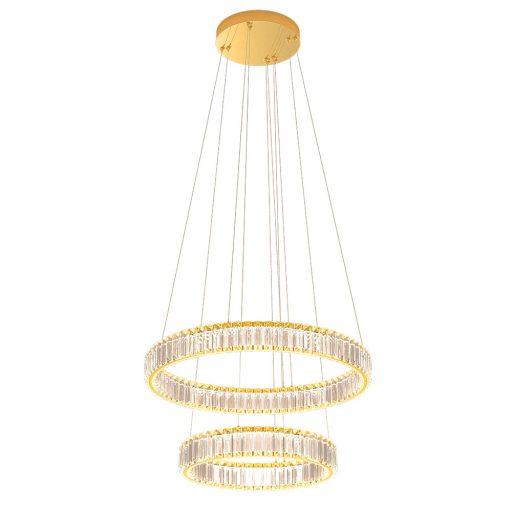 Fényes arany színű fém vázas függeszték lámpa 40 és 60cm átmérőjű kristályokkal díszített búrával, beépített meleg fehér színhőmérsékletű LED fényforrással. A lámpa fényereje fali kapcsoló segítségével (fel-le kapcsolással) 3 (30-60-100%) lépcsőben állítható.