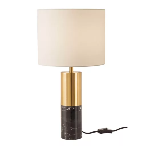 Fényes arany színű fém és fekete márvány lábas asztali lámpa 25 cm átmérőjű, bézs színű lámpaernyővel.