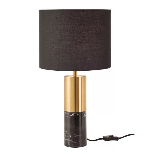 Fényes arany színű fém és fekete márvány lábas asztali lámpa 25 cm átmérőjű, fekete színű lámpaernyővel.