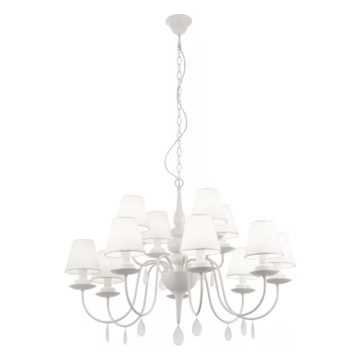 12 ágú, 92cm átmérőjű csillár fehér színű fém vázzal, E14-es foglalattal és fehér színű lámpaernyőkkel.