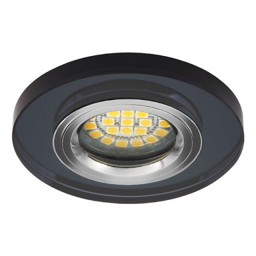 Fekete színű üveg fix mennyezeti spot lámpa fém gyűrűvel. A lámpa működtetéséhez 12V-os trafó szükséges, ami nem tartozék. A lámpa foglalata viszont cserélhető GU10-es foglalatra, amivel már nincs szükség külön működtetőre.