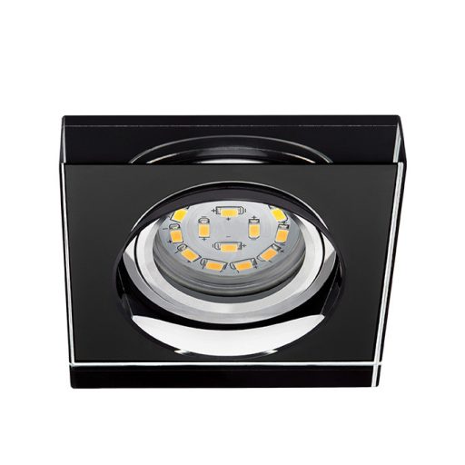 Fekete színű üveg fix mennyezeti spot lámpa fém gyűrűvel. A lámpa működtetéséhez 12V-os trafó szükséges, ami nem tartozék. A lámpa foglalata viszont cserélhető GU10-es foglalatra, amivel már nincs szükség külön működtetőre.
