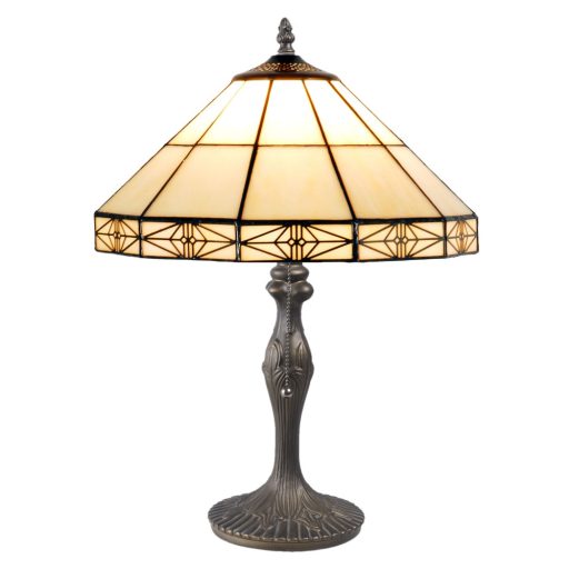 Bronzos barna színű polyresin vázas asztali lámpa 32cm átmérőjű, bézses árnyalatú Tiffany üveg búrával, húzókapcsolóval.