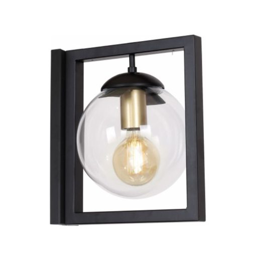 Fekete színű fém vázas fali lámpa arany színű fém foglalatos, átlátszó üveg búrával, E27-es foglalattal.