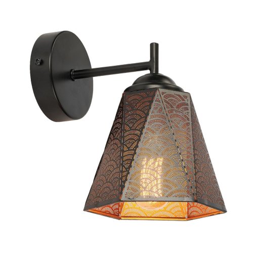 Fekete színű fém vázas fali lámpa perforált, kívül fekete, belül arany színű fém búrával, E27-es foglalattal.