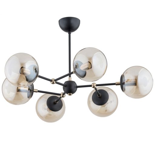 Fekete színű fém függő lámpa borostyán színű üveg búrával, E14-es foglalattal.