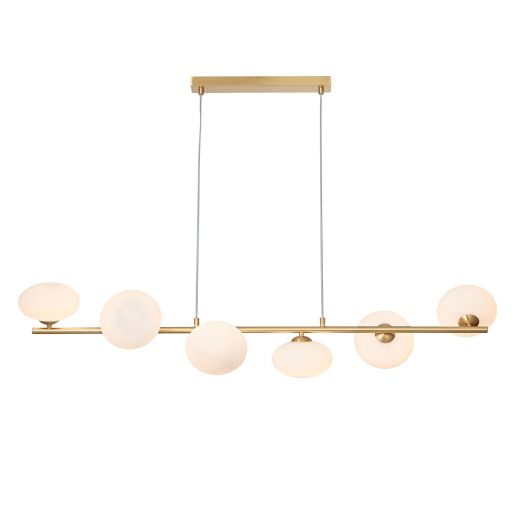 Arany színű fém vázas függesztett lámpa fehér színű ovális üveg búrával, 6xG9-es foglalattal.