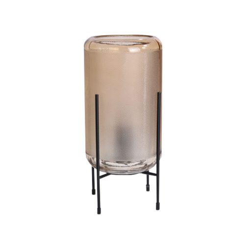 Fekete színű fém vázas asztali lámpa rapcsos, borostyán színű üveg búrával, E27-es foglalattal.
