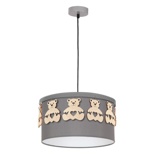 Szürke színű fém vázas függesztett lámpa textil búrával, E27-es foglalattal, natúr fából készült mackó dekorral. A mackók leakaszthatóak, így nem kisgyermekkortól akár felnőtt korig használható.
