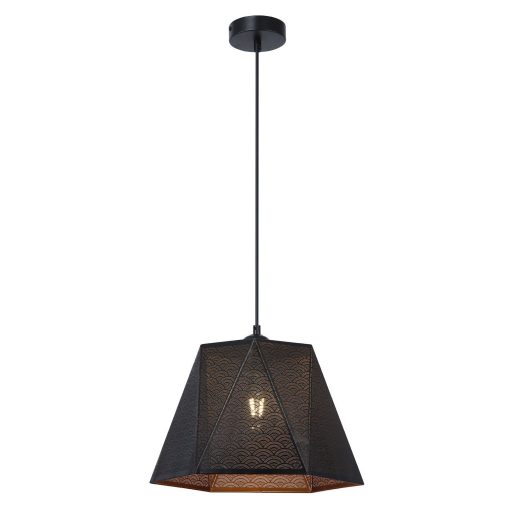 Fekete színű fém vázas függesztett lámpa perforált, kívül fekete, belül arany színű fém búrával, E27-es foglalattal.