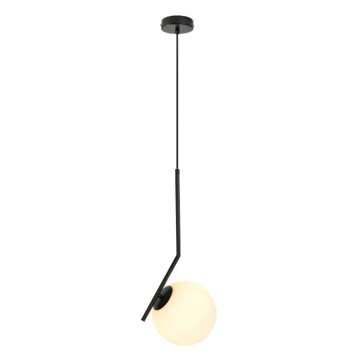 Fekete színű fém vázas függesztett lámpa fehér színű üveggömb búrával, E27-es foglalattal.