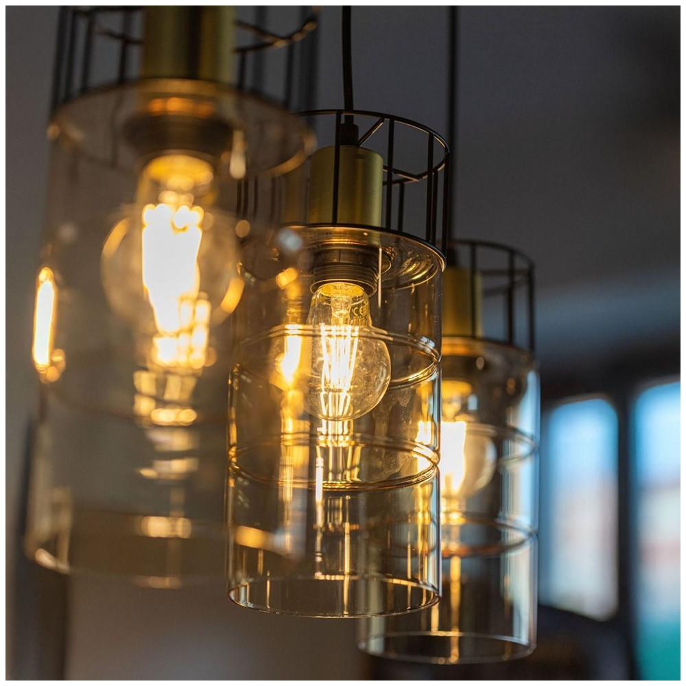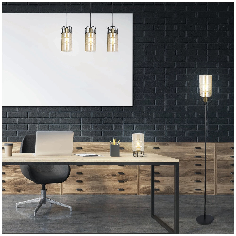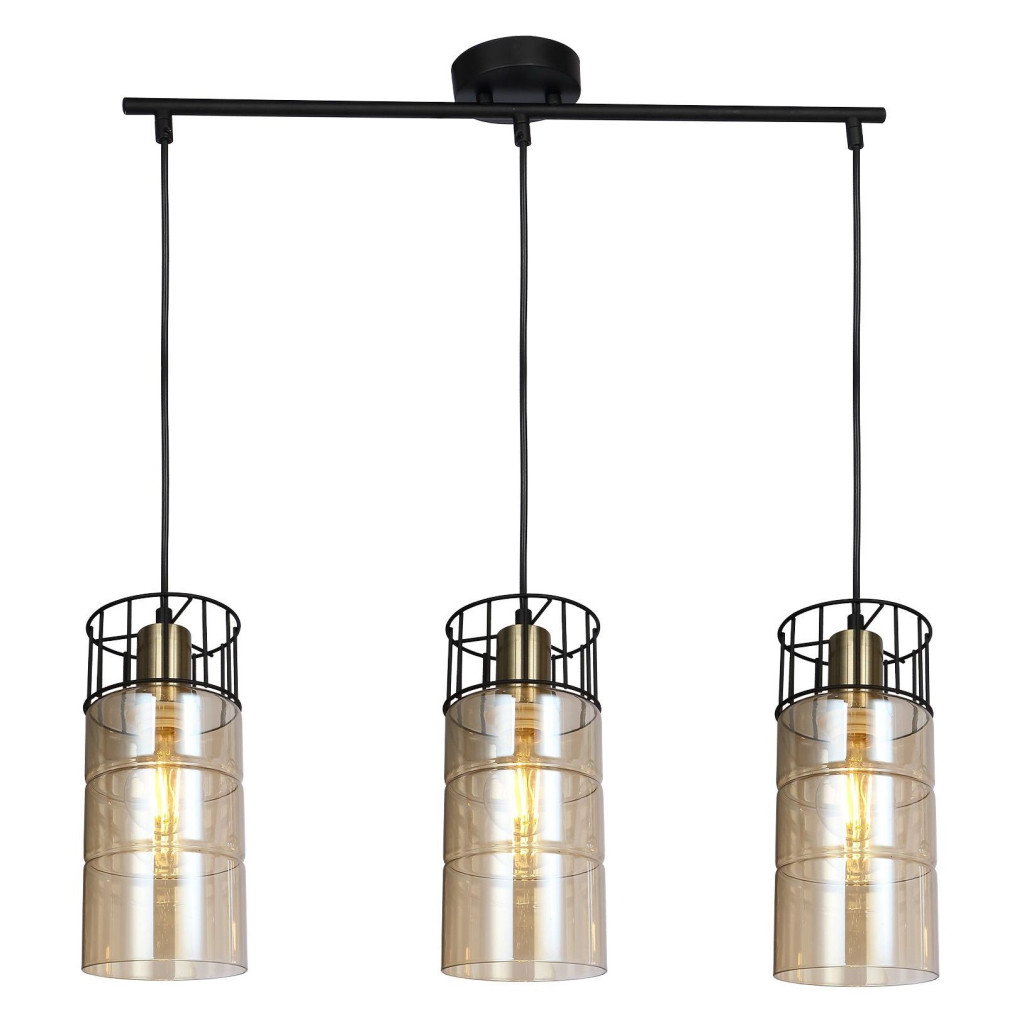 Fekete színű fém vázas függesztett lámpa sárgaréz betéttel, füstszínű üveg búrával, E27-es foglalattal.