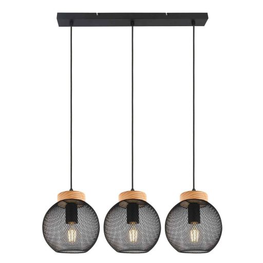 Fekete színű fém és natúr fa függesztett lámpa 3db E27-es foglalattal.