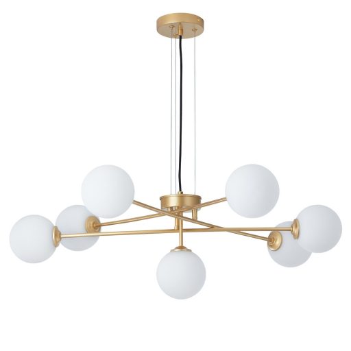Arany színű fém vázas függesztett lámpa fehér színű üveg búrával, 7xG9-es foglalattal.