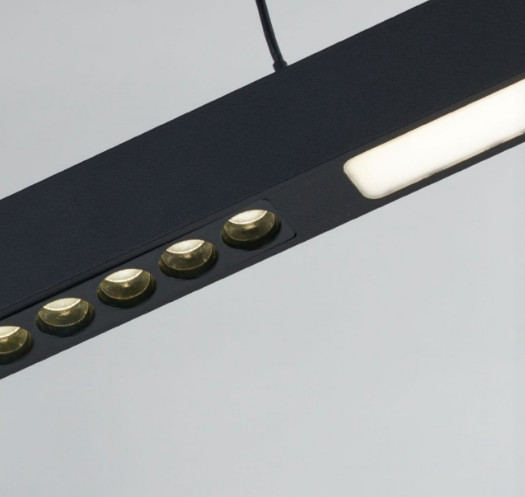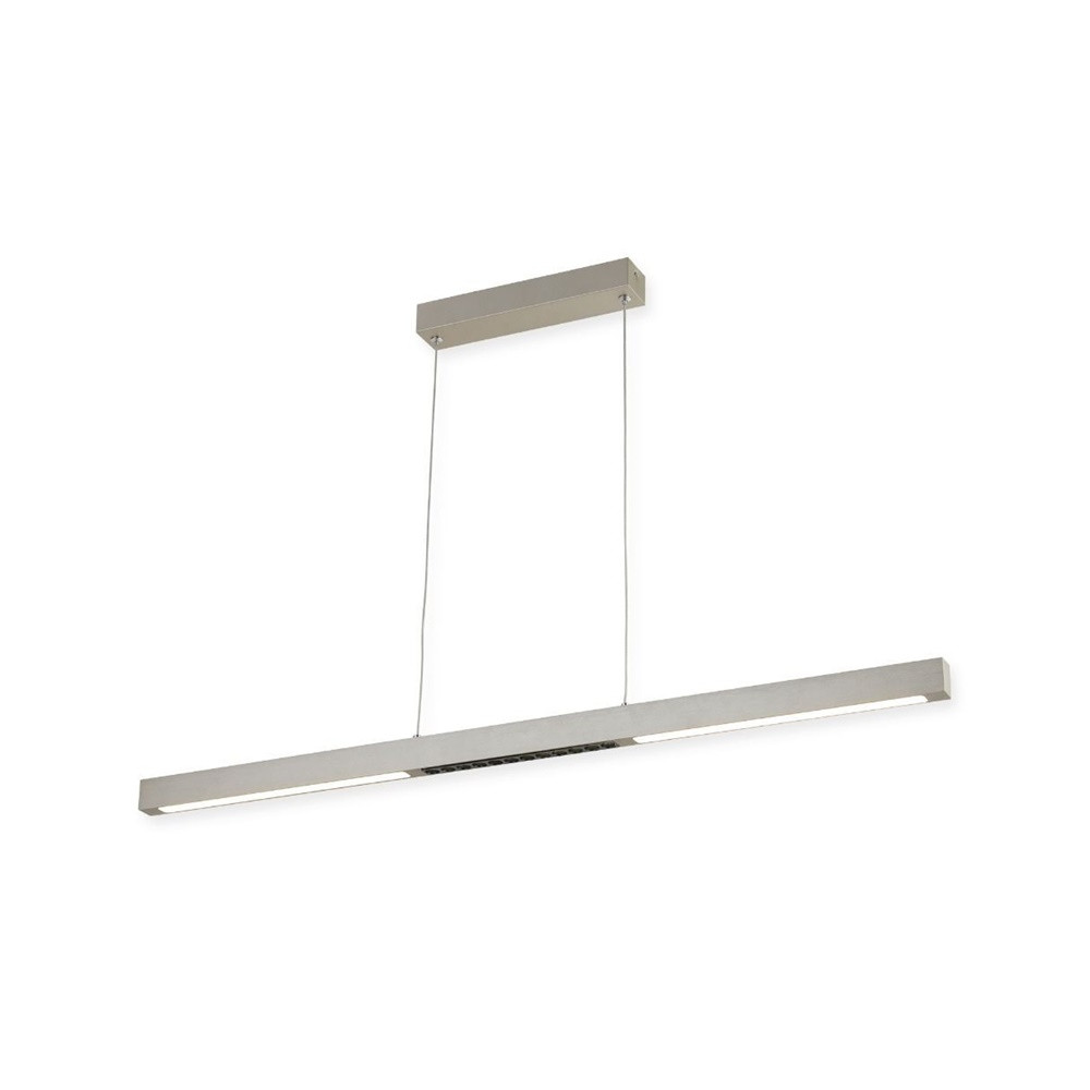 Ezüst színű alumínium függesztett lámpa fehér színű műanyag betétes búrával, természetes fehér színhőmérsékletű beépített LED fényforrással.
