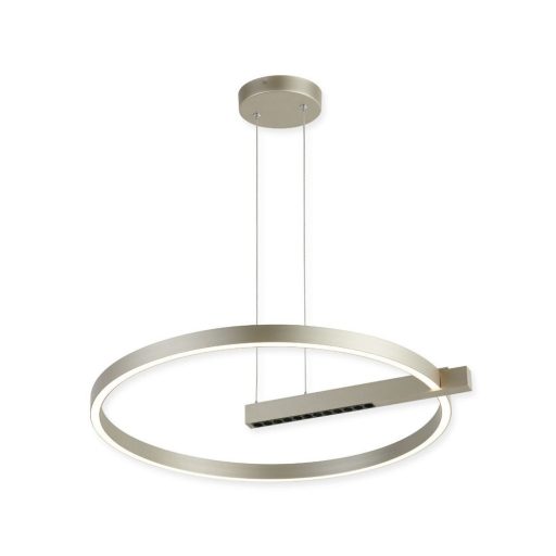Ezüst színű alumínium függesztett lámpa fehér színű műanyag betétes búrával, természetes fehér színhőmérsékletű beépített LED fényforrással.