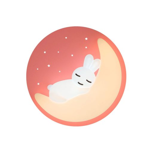 Fém vázas mennyezeti lámpa rózsaszín alapon nyulat és holdat ábrázoló műanyag búrával, beépített LED fényforrással. A LED színhőmérséklete változtatható 3000 vagy 6000Kelvinre, azaz meleg vagy hideg fehér színre.