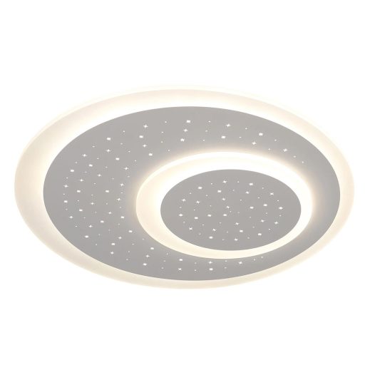 Fehér színű fém mennyezeti lámpa acryl betétes búrával, csillagos égbolt effekttel, beépített LED fényforrással. A lámpához távirányító tartozik, amivel állítható a lámpa fényereje és színhőmérséklete 3000-6000K között, illetve éjszakai fény funkcióval is rendelkezik.