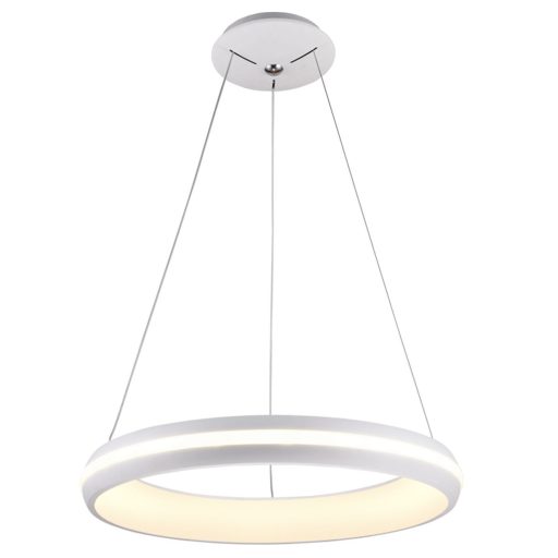 Fehér színű fém vázas függesztett lámpa fehér színű acryl búrával, beépített LED fényforrással. A LED színhőmérséklete fali kapcsoló fel/le kapcsolásával állítható 3000/4000/6000K között. 3000K led teljesítménye 50W, a 6000K led teljesítménye szintén 50W. A 4000K-t a lámpa a két led együttes felkapcsolásával éri el, így lesz ebben az esetben a teljesítménye 100W.
