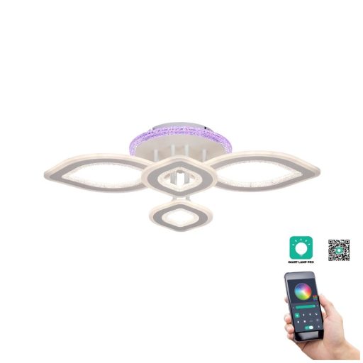 Fehér színű fém mennyezeti lámpa acryl keretben elhelyezkedő beépített LED fényforrással. A lámpához távirányító tartozik, mely segítségével állítható a lámpa fényereje és színhőmérséklete 3000/4000/6500K között, a fali elem körvonalán lévő LED színe, illetve éjszakai fény funkció is választható.