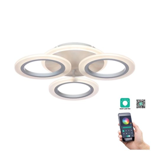 Fehér színű fém mennyezeti lámpa acryl keretben elhelyezkedő beépített LED fényforrással. A lámpához távirányító tartozik, mely segítségével állítható a lámpa fényereje és színhőmérséklete 3000/4000/6500K között, illetve éjszakai fény funkció is választható.