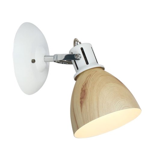 Fehér és fa imitációs fém billenthető fejű spot lámpa E27-es foglalattal.