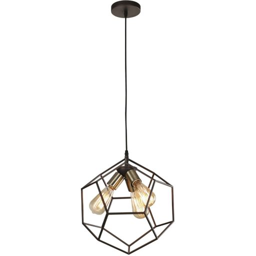 Fekete színű fém függesztett lámpa 3db arany színű E27-es foglalattal, fémrács búrával.