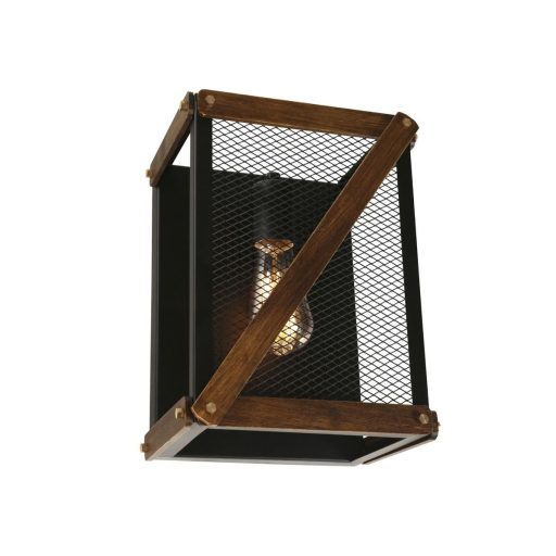 Fekete színű fém vázas fali lámpa fa betétes, fémrács búrával, 1db E27-es foglalattal.