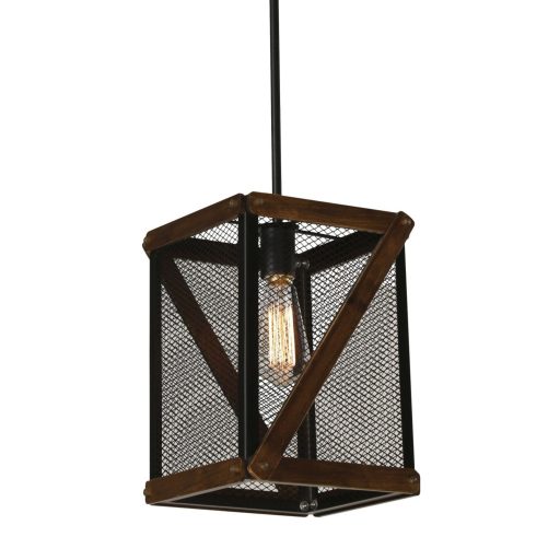 Fekete színű fém vázas függesztett lámpa fa betétes, fémrács búrával, 1db E27-es foglalattal.