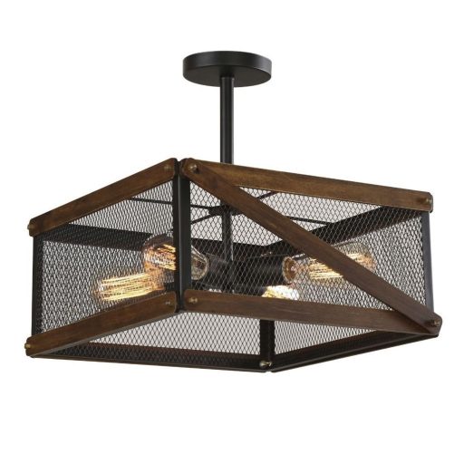 Fekete színű fém vázas mennyezeti lámpa fa betétes, fémrács búrával, 4db E27-es foglalattal.