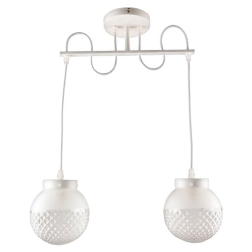 Fehér színű fém vázas függesztett lámpa felül opálos, alul mintás, áttetsző üveggömb búrával, E27-es foglalattal.