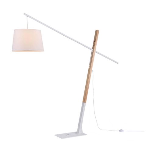 Fehér színű fém és natúr fa vázas álló lámpa fehér színű textil bevonatos pvc búrával, 1db E27-es foglalattal, vezetékre szerelt kapcsolóval.